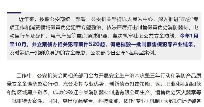 11月24日,九派新闻从公安部获悉,近年来,按照公安部统一部署明利配资,公安机关坚持以人民为中心,深入推进“昆仑”专项工作和消费领域假冒伪劣犯罪专题整治,依法严厉打击制售假冒伪劣消防器材、电动自行车及配件、电气产品等重点领域犯罪,坚决筑牢社会公共安全防线。今年1月至10月,共立案侦办相关犯罪案件520起,彻底摧毁一批制假售假犯罪产业链条,及时消除一批群众身边的安全隐患。公安部今日公布5起典型案例明利配资。